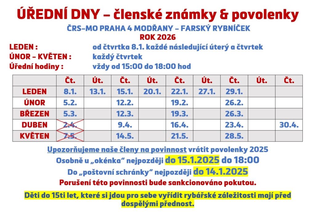 Upozorňujeme proto všechny rybáře, že termín vrácení povolenky za rok 2025 je 15. leden 2026 resp. do 15. ledna 2026 MUSÍ být povolenka zaregistrovaná v evidenčním systému RIS jako vrácena.